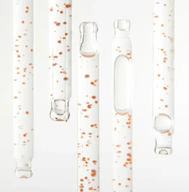 The serum features a refreshing, essence-like consistency with vibrant orange capsules that melt into the skin, absorbing quickly without stickiness.